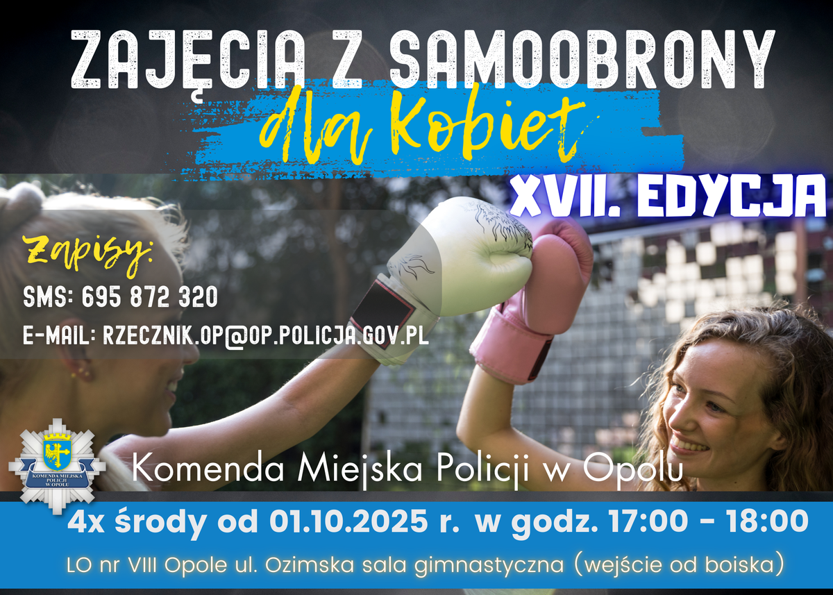 Po wakacyjnej przerwie ruszamy z zapisami na kolejną edycję zajęć z samoobrony dla kobiet prowadzoną przez policjantów - instruktorów. W trakcie zajęć uczestniczki dowiedzą się jak szybko i odpowiednio reagować na niebezpieczne sytuacje, przećwiczą oswobadzanie się z uchwytów czy to, w jaki sposób się bronić, adekwatnie do zagrożenia. Pierwsze zajęcia już w środę, 1 października o godz. 17:00, na sali gimnastycznej Liceum Ogólnokształcącego nr VIII w Opolu, ul. Ozimska.