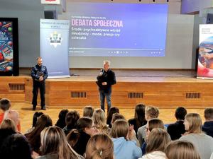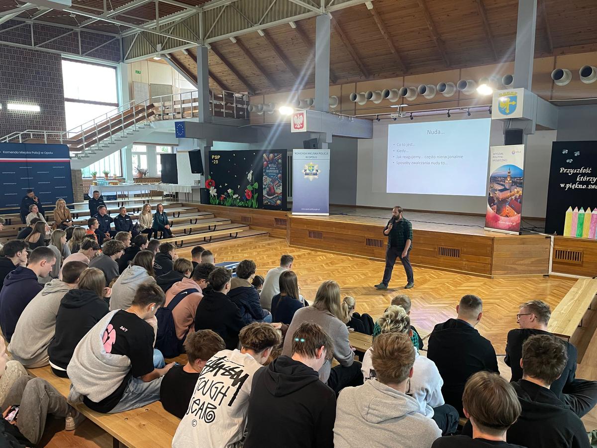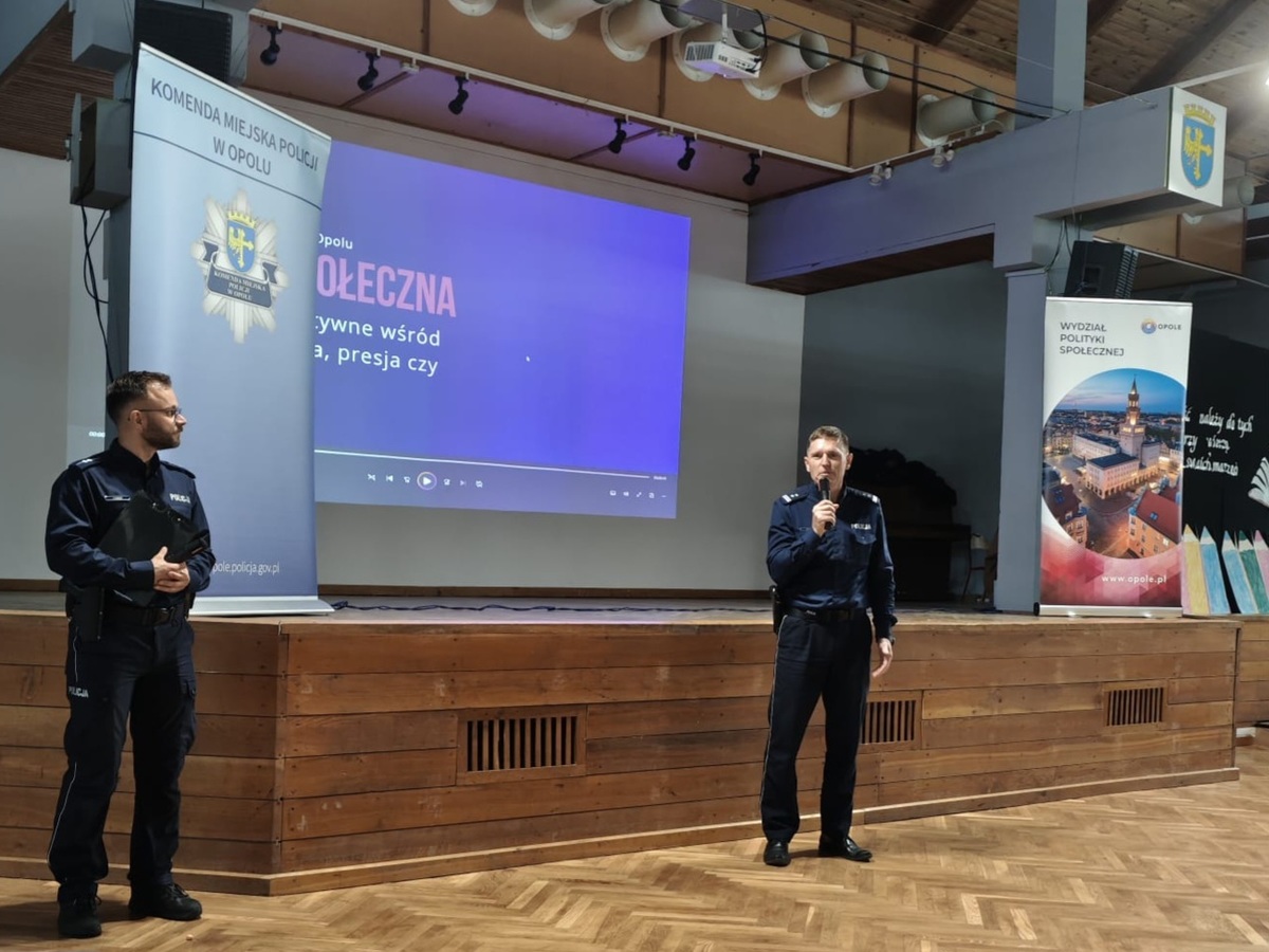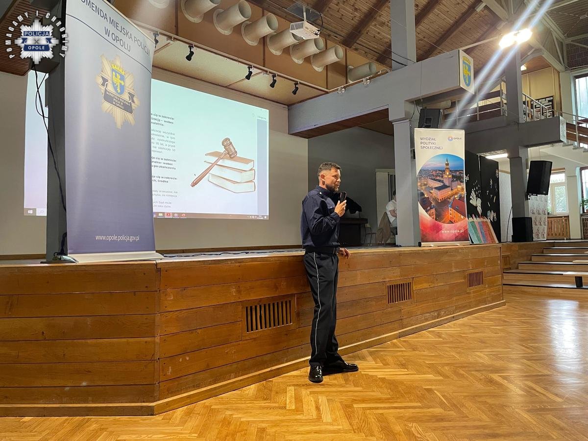 Głos jako pierwszy zabrał Naczelnik Wydziału Prewencji Komisariatu Policji II w Opolu, kom. Krzysztof Adamiec, który omówił odpowiedzialność prawną wśród osób nieletnich. Przedstawił również problematykę demoralizacji wśród dzieci i młodzieży oraz działania, które podejmujemy, aby zniwelować to zagrożenie.