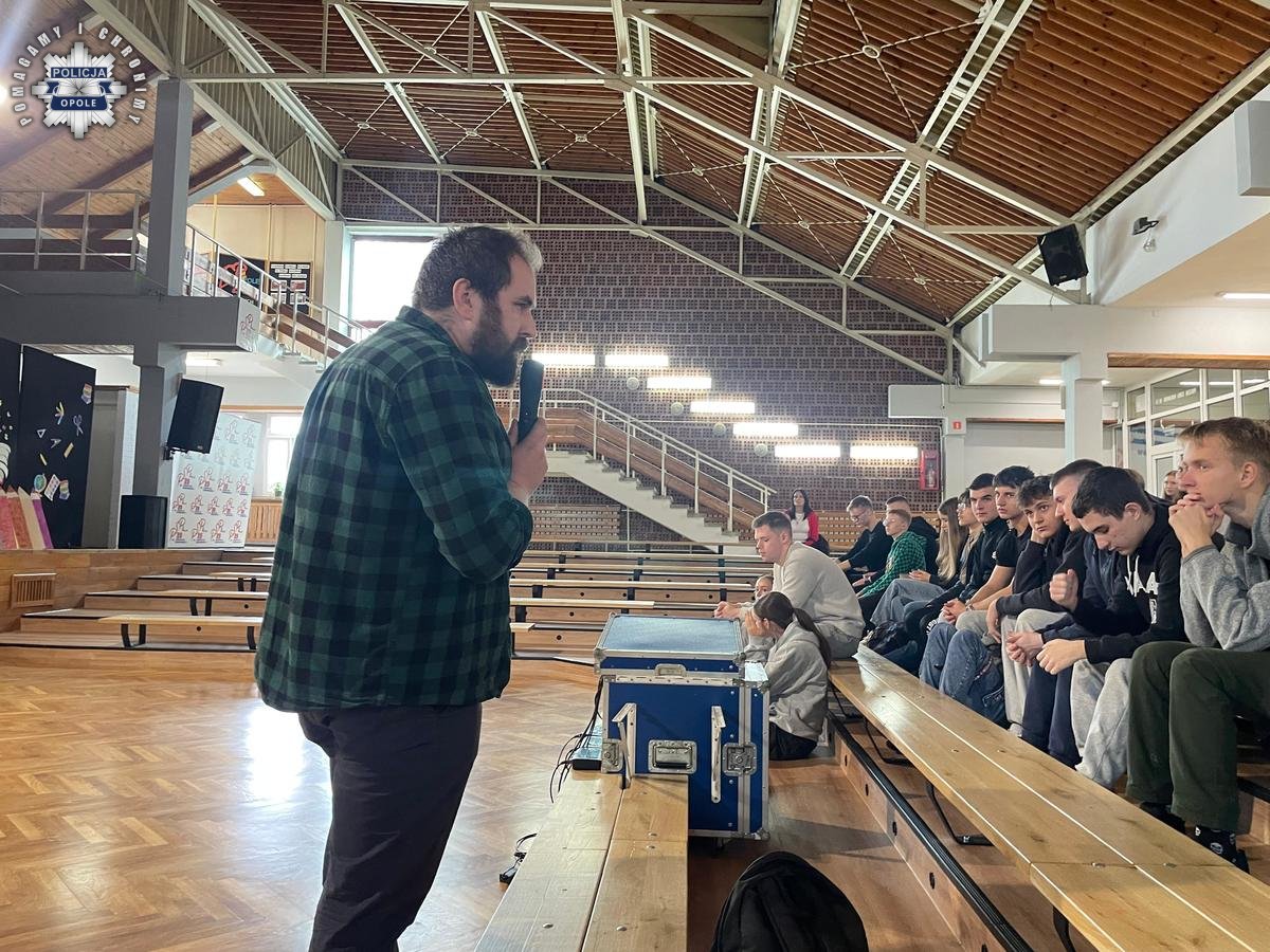 Trzecim prelegentem był wykładowca Instytutu Nauk Pedagogicznych Uniwersytetu Opolskiego pan mgr Sławomir Kania, który poruszył zagadnienie presji rówieśniczej i sposobów na radzenie sobie z nieodpowiednią namową prowadzącą do zażywania środków odurzających.
