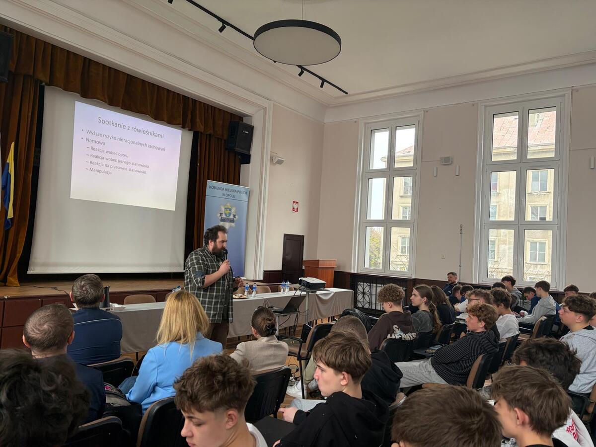 Policjanci z Komendy Miejskiej Policji w Opolu wspólnie z Wydziałem Polityki Społecznej Urzędu Miasta Opola zorganizowali debatę społeczną poświęconą zagadnieniu używania środków psychoaktywnych wśród młodzieży. Zaproszeni prelegenci poruszyli problematykę odpowiedzialności prawnej wśród osób nieletnich, aspekt zdrowotny zażywania narkotyków oraz problematykę presji otoczenia. Spotkanie odbyło się w Zespole Szkół Zawodowych im. Stanisława Staszica w Opolu. W spotkaniu wzięło udział ponad 170 uczniów z opolskich szkół: Zespołu Szkół Budowlanych w Opolu, Zespół Szkół Technicznych i Ogólnokształcących im. K. Gzowskiego w Opolu, Zespół Szkół Mechanicznych w Opolu, Liceum Ogólnokształcące nr IX w Opolu oraz Zespół Szkół Zawodowych im. St. Staszica w Opolu.