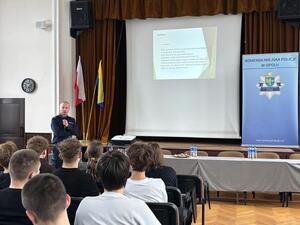 Trzecim prelegentem był wykładowca Instytutu Nauk Pedagogicznych Uniwersytetu Opolskiego pan mgr Sławomir Kania, który poruszył zagadnienie presji rówieśniczej i sposobów na radzenie sobie z nieodpowiednią namową prowadzącą do zażywania środków odurzających.