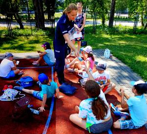 Przez cała wakacje policjanci z komendy miejskiej odwiedzają miejsca, w których prowadzone są półkolonie i zajęcia rekreacyjno - sportowe dla dzieci i młodzieży. Mundurowi przypominają o zasadach bezpiecznego wypoczynku i unikania zagrożeń. Tym razem odwiedzili grupę dzieci spędzających czas wolny na półkoloniach przy Młodzieżowym Ośrodku Sportu w Opolu.